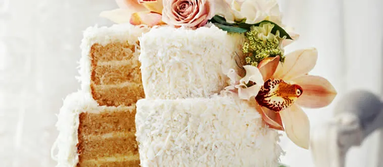 Which cake is typically served at weddings and has multiple tiers?